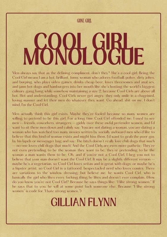 It was inspired by an edit of Amy Dunne from Gone Girl reciting the “Cool Girl Monologue.” The “Cool Girl” is the ultimate girlfriend in that she likes every single thing the man likes and never nags or complains. She remains always thin and always beautiful for his consumption. She’s never described as funny or even smart because who cares? The men these pretender women attract certainly don’t.